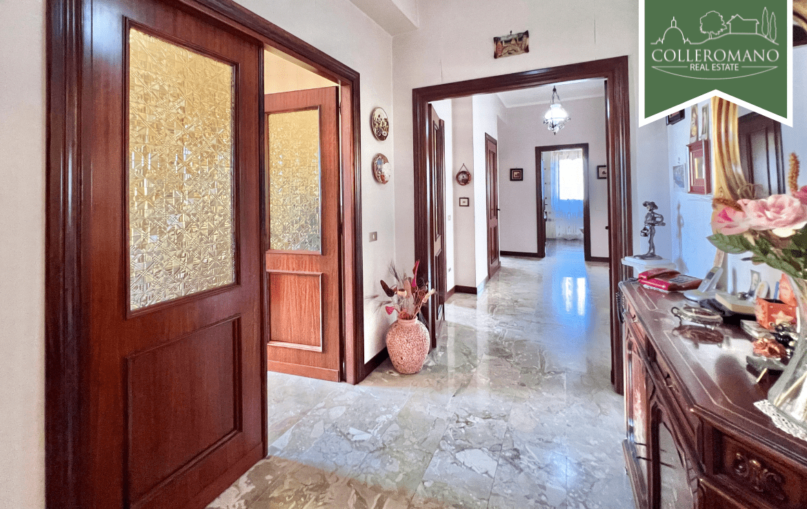 L’appartamento al piano terra, di circa 160 mq, è composto da un ampio ingresso, soggiorno, cucina abitabile con camino, tre ampie camere da letto e due bagni. Completa il piano un balcone panoramico.